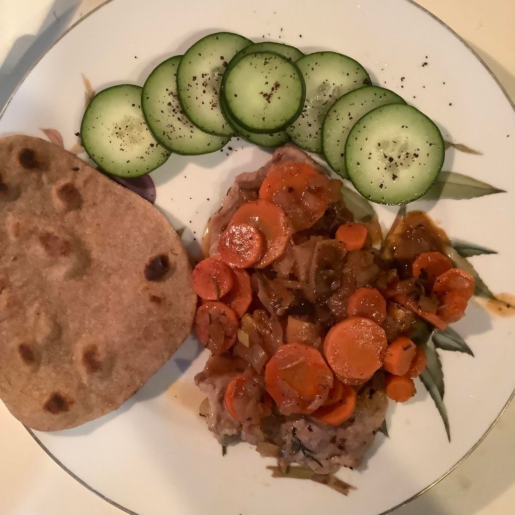| 3 oz cucumber per person [13 calories]—–1.6 oz gozleme bread [26 calories] | Divide meat, fruit and sauce between 2 plates. Serve with sliced cucumbers and gozleme bread. |