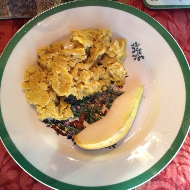 ++ 1½ two-oz eggs HINT: If you are serving one person, crack three 2-oz eggs into a small bowl or glass measuring cup. Whip up those eggs and pour half of their volume into a jar with a lid to store in the ‘fridge for next week. ++++ ¼ oz Cheddar cheese ++++ ¼ tsp Worcestershire sauce ++++ ½ tsp dry mustard ++++ 1 oz pear or strawberries ++++ Optional: blackish coffee [53 calories] or blackish tea or mocha cafe au lait [65 calories] ++++ Optional: 5 oz fruit smoothie or berry-yogurt smoothie [88 calories] ++