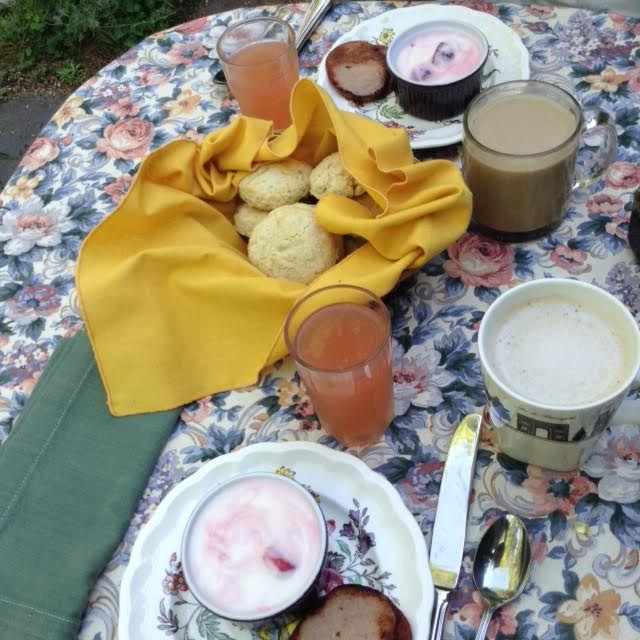 Here the table is set with the full meal: fruit yogurt [we add our own fruit to low-fat yogurt], Canadian bacon [back bacon to many of you], cafe au lait, rhubarb juice, and of course the Lavender Scones. A delightful Summer meal.