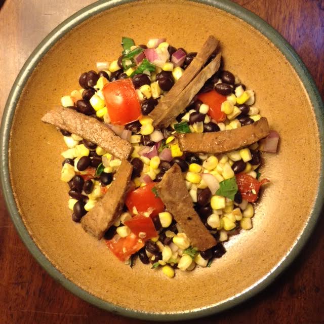 Tomato-Corn-Black Bean Salad: 274 calories 9 g fat 16.5 g protein 34.7 g carbs [34 g Complex] 63.4 mg Calcium PB GF For a real late Summer treat, you can’t beat fresh corn and tomatoes! 100Daysofrealfood provided the recipe and then I altered it a little. HINT: This serves TWO.