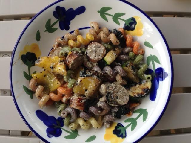 Sometimes, there is a crowd to feed and that’s when we turn to one of our stand-by meals: Grilled Vegetable Pasta with Sausage. The vegetables include: zucchini/summer squash, yellow or orange sweet peppers, red onion, and or other colorful fresh items of the same texture. Choose any pasta you wish — 2 ounces by weight per person. Bratwurst or Italian sausage will do just fine. Make 1-1/2 cups of your favorite white sauce and add 1/2 cup of grated Parmesan cheese.