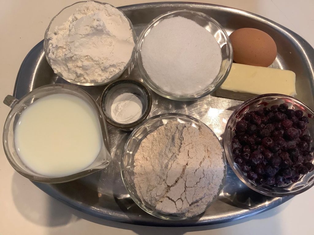 ++1 cup unbleached flour++++ 1 cup white whole wheat flour++++ 3/4 cup sugar++++ 3 teaspoons baking powder++++ 1 teaspoon salt++++ 1/3 cup butter [fairly soft so it will mix]++++ 1 cup milk**++++ 1 egg++++ 1/4 teaspoon almond extract++++ 1 cup blueberries [fresh or frozen — frozen are better since they don’t mush up when stirred in which turns the batter a nasty grayish-blue]++ **You could use buttermilk or plain yogurt instead of milk, and then you would need to add 1 teaspoon of baking soda to the above ingredients.
