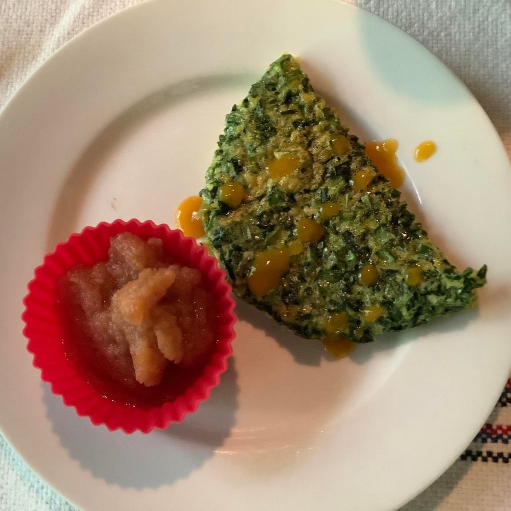 Mince or press the garlic. Squeeze then chop the spinach. Combine the vegetables with the fish sauce and hot sauce, then whisk in the egg. Pour into a lightly-oiled baking dish and bake at 350 F. for 12-15 minutes. Serve with the sliced apples and beverages of your choice. A bit more Sriracha is a great idea.