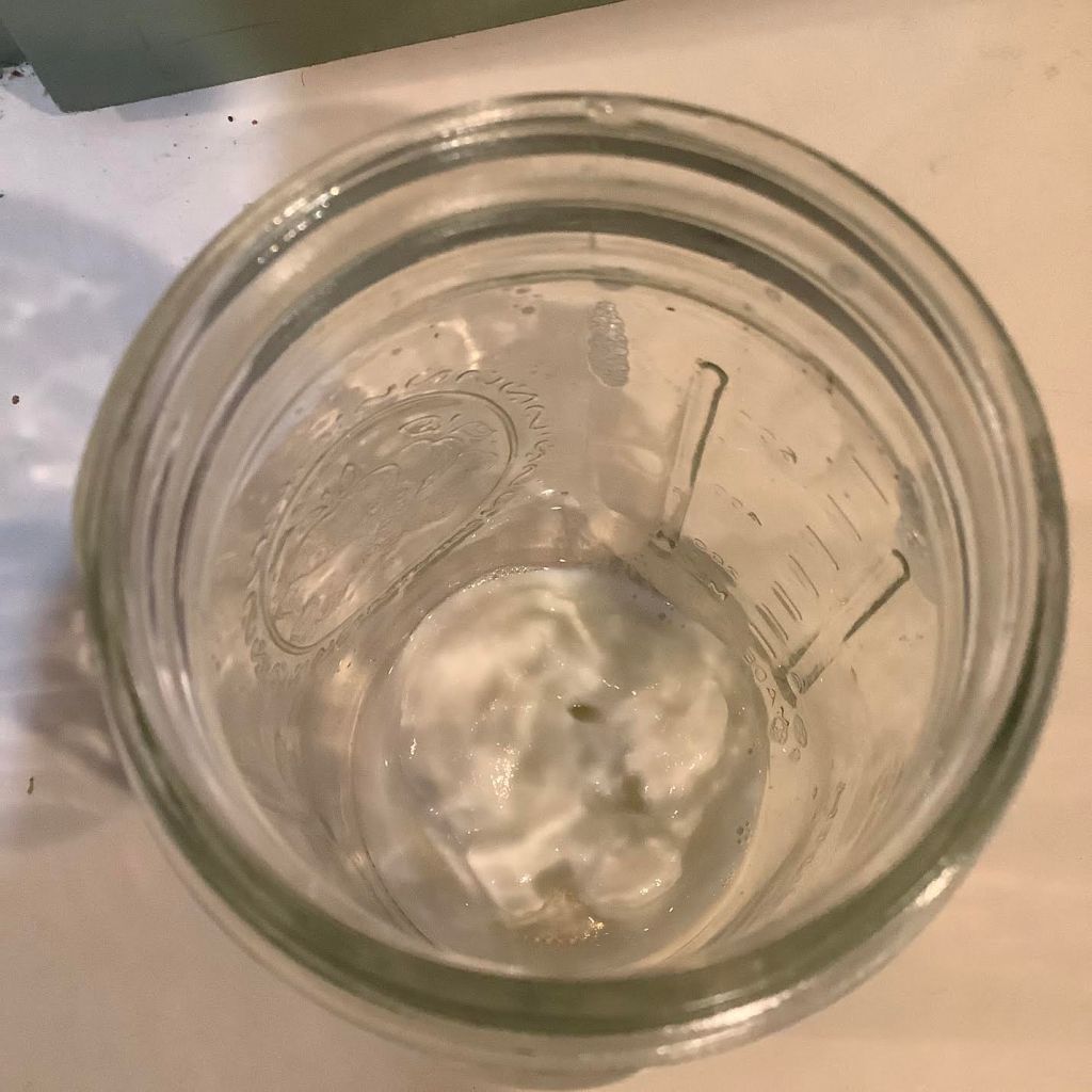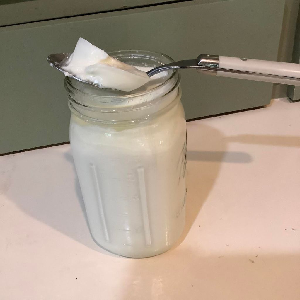 Here is 1 Tablespoon of yogurt in the bottom of the 1-Qt glass jar.