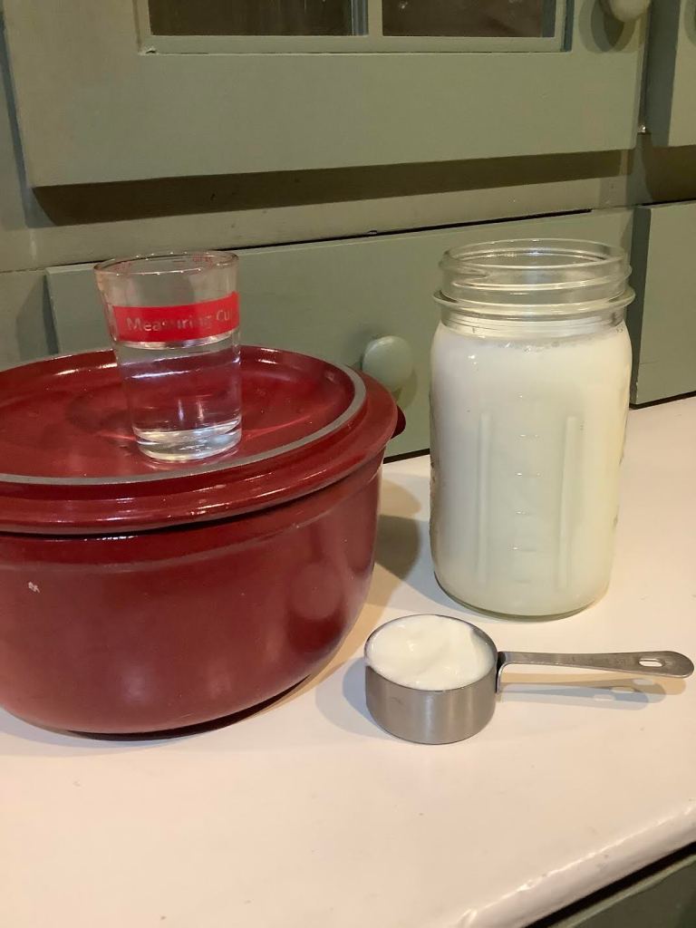 1 quart milk, 1/4 cup yogurt, the heavy pan to heat the milk, the glass jar in which the yogurt will ripen over-night, the little amount of water for the bottom of the heating pot.
