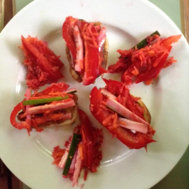 Slice the pork thinly and brush with Asian chili + soy sauce mixture. If meat is uncooked, brush with the chili/soy mixture, then briefly saute until barely pink. Prepare the sesame-ginger dressing and set aside in a small bowl. Slice and grate the vegetables and toss in the sesame-ginger dressing. Slice the bread and arrange it on the serving plate. Top with pork, then with vegetables, then the dressing. Serve remaining slaw in a small dish. Done! We ate everything with our fingers.