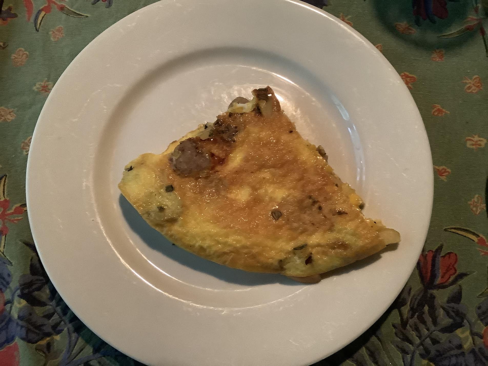1 ½ two-oz eggs HINT: If you are serving one person, crack three 2-oz eggs into a small bowl or glass measuring cup. Whip up those eggs and pour half of their volume into a jar with a lid and put it in the ‘fridge for next week. 1 link chicken breakfast sausage = 35 calories per sausage ¾ oz apple sage, fresh or dried Optional: blackish coffee [53 calories] or blackish tea or mocha cafe au lait [65 calories] or lemon in hot water Optional: 5 oz fruit smoothie or berry-yogurt smoothie [88 calories]