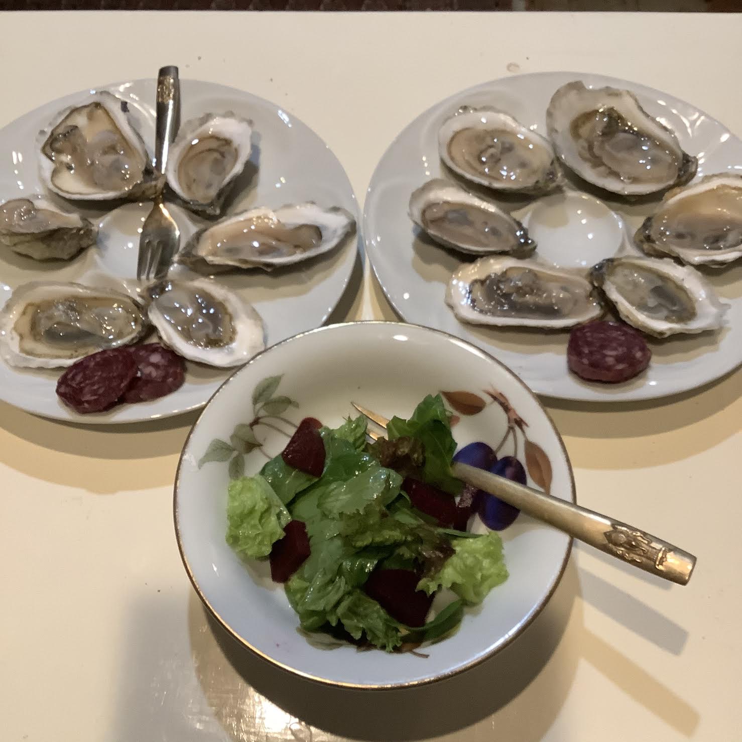 Whisk the oil and vinegar in a wide bowl. Break the spinach leaves into the bowl and toss gently to cover with the dressing. Put the walnuts and beets in the bowl over the salad. Shuck the oysters and enjoy your special meal.