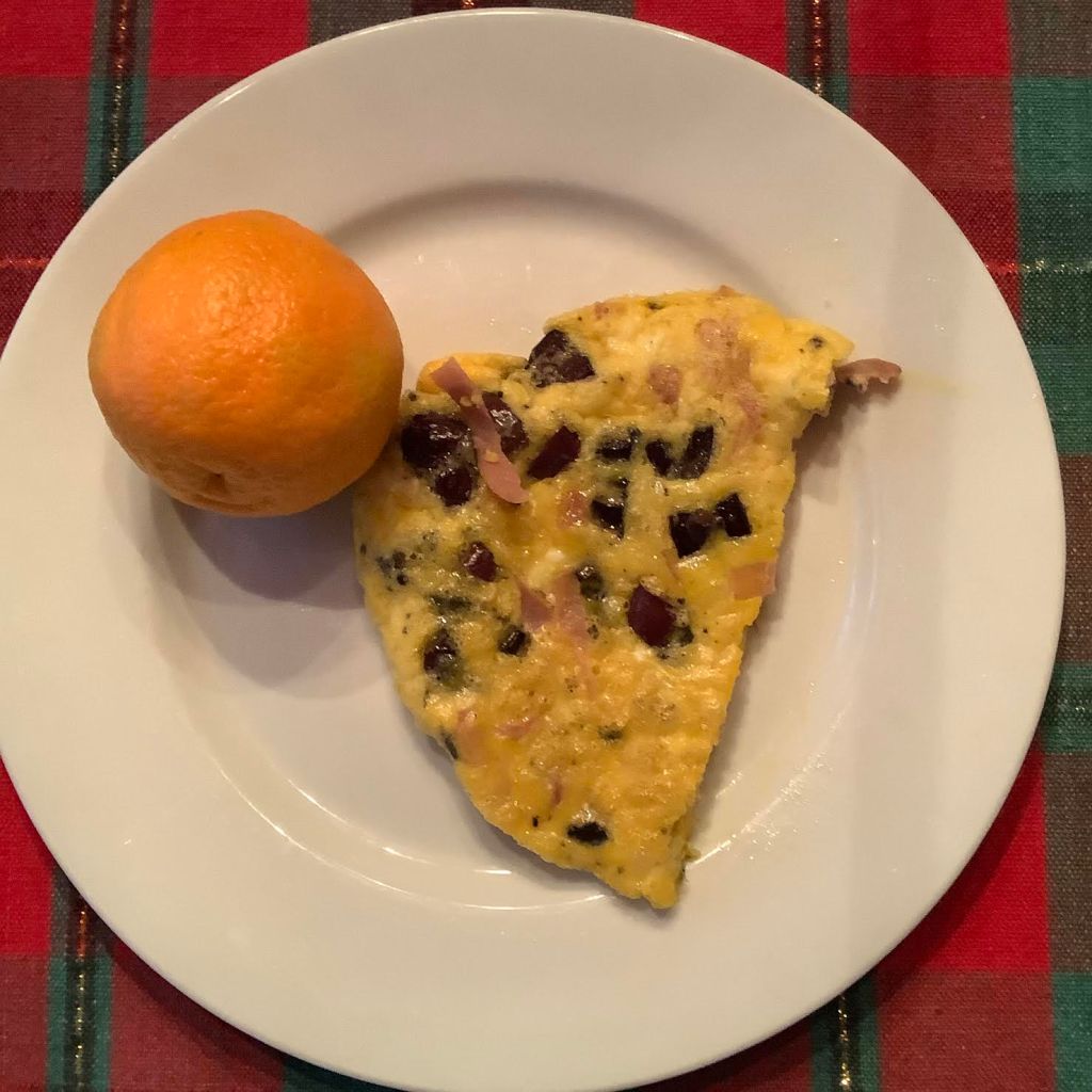 Chop the meat and the olives. Spritz a ramekin with non-stick spray. Whisk the eggs. Stir in the meat and olives, and pour into the ramekin. Resist the urge to add much salt — the meat and the olives are salty to begin with. Bake at 350F. for 12-15 minutes. Plate with the fruit and pour the beverage of choice.