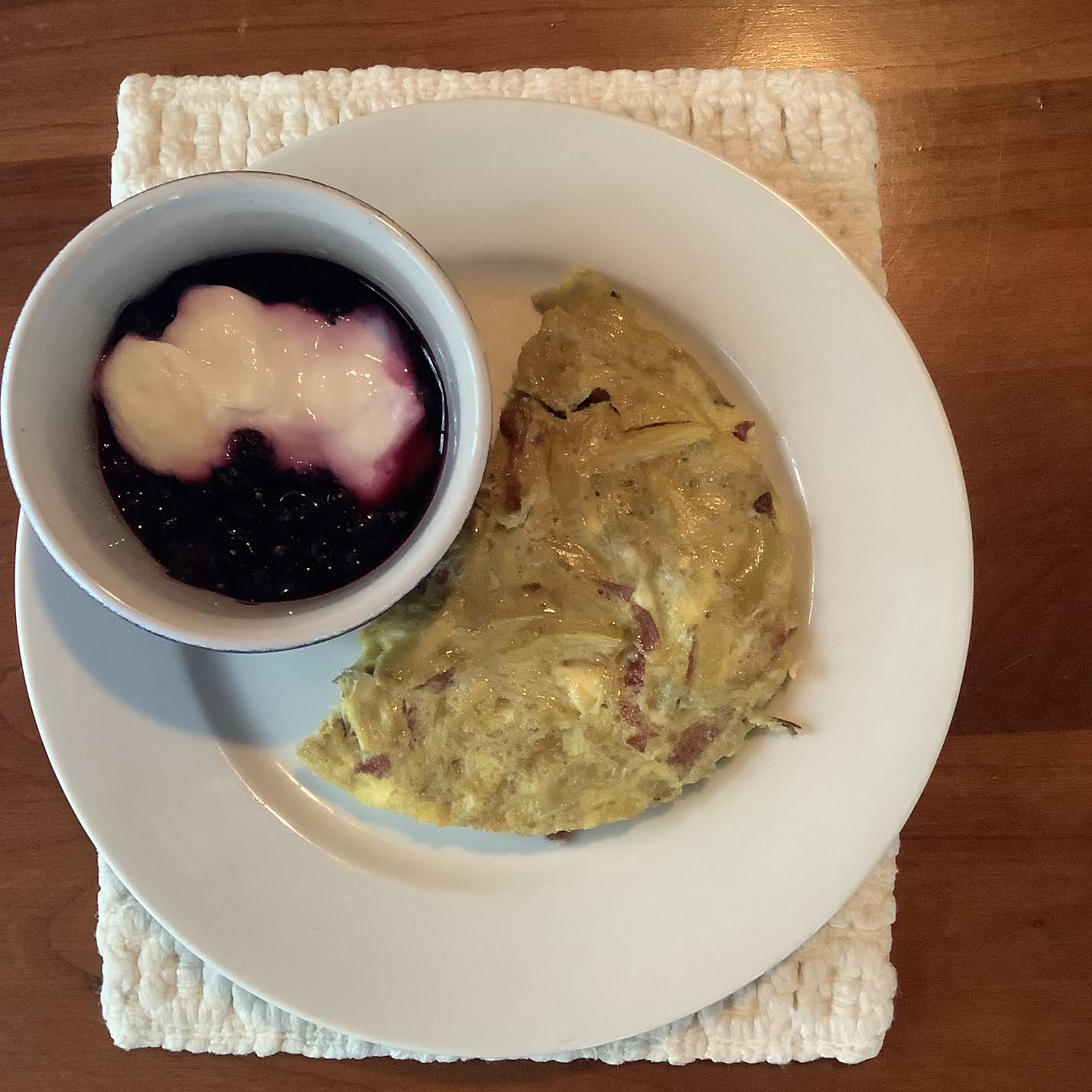 1 two-oz egg 1/4 oz uncured capicola, diced 3/4 oz artichoke hearts, marinated and purchased in a jar 1 Tbsp reduced-fat cottage cheese 1/4 cup blueberries or strawberries + 2 Tbsp plain, fat-free yogurt Optional: blackish coffee [53 calories] or blackish tea or mocha cafe au lait [65 calories] or lemon in hot water Optional: 5 oz fruit smoothie or berry-yogurt smoothie [88 calories]