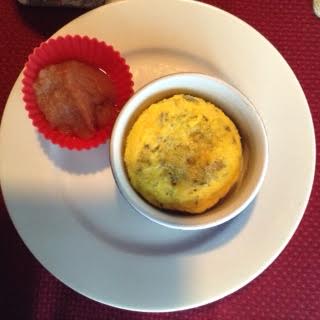 With the back of a spoon, mash the cottage cheese through a sieve to break up the lumps and make it smooth. Whisk the cheese with the egg and seasonings. Spritz a ramekin with oil or non-stick spray. Dice the sausage and put it into the ramekin. Pour the egg mixture on top and bake in the toaster oven at 350 degrees F. for 12-15 minutes, depending on how you like your eggs. Brew your optional beverage, shake and pour the optional smoothie, dish that lovely applesauce. Nice start to your day.