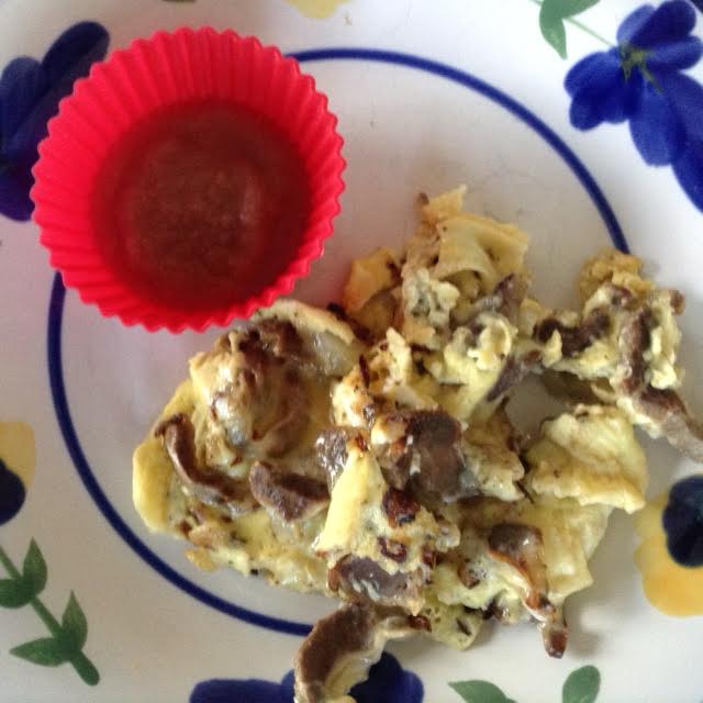 Three 2-oz eggs of which you will use 1 ½ eggs per person HINT: If you are serving one person, crack three 2-oz eggs into a small bowl or glass measuring cup. Whip up those eggs and pour half of their volume into a jar with a lid and put it in the ‘fridge for next week. ½ oz gizzards, cleaned and simmered in seasoned stock for 1½ hours [HINT: cook up a bunch of gizzards at the same time for future use] 1 clove garlic, minced sage + salt + pepper 1 oz applesauce Optional: blackish coffee [53 calories] or blackish tea or mocha cafe au lait [65 calories] or lemon in hot water Optional: 5 oz fruit smoothie or berry-yogurt smoothie [88 calories]