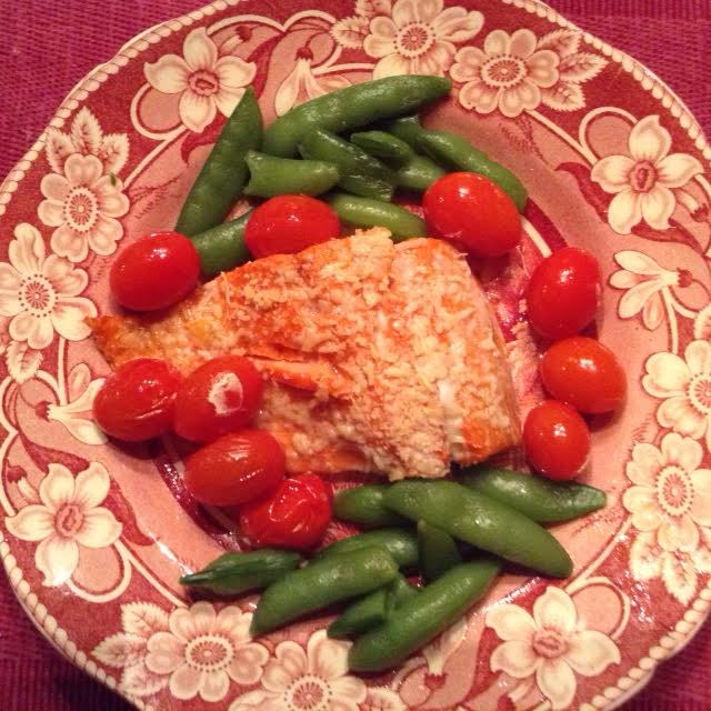 4 oz salmon 10 cherry tomatoes [5 oz] 1 Tbsp Parmesan cheese, grated ½ cup green beans or 2 oz sugar snap peas seasonings to taste
