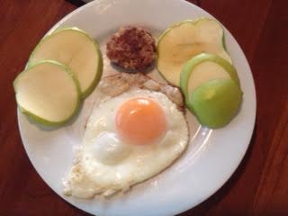 1 two-oz egg, pan-fried 1 slice Canadian bacon [aka: ‘back bacon’] 2 oz apple, sliced in rounds, not wedges 1 pan muffin Optional: blackish coffee [53 calories] or blackish tea or mocha cafe au lait [65 calories] or lemon in hot water Optional: 5-6 oz fruit smoothie or berry-yogurt smoothie [88 calories]