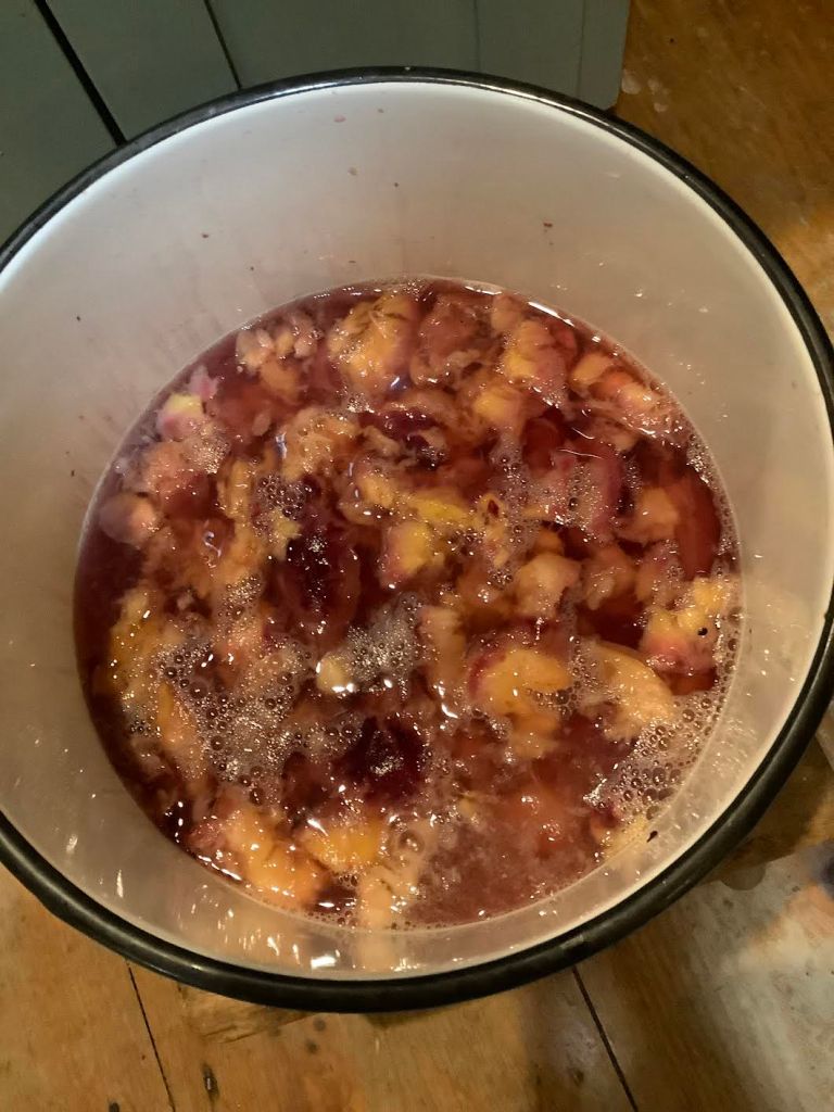 Squished peaches covered with boiling water in the sterilized bucket. The covered bucket cools over night.
