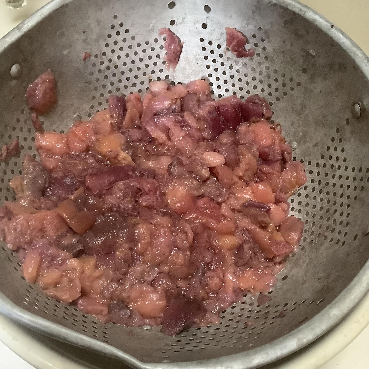 | Mashed peaches in water | Strain the peaches through the colander into the bowl, saving the juice. |