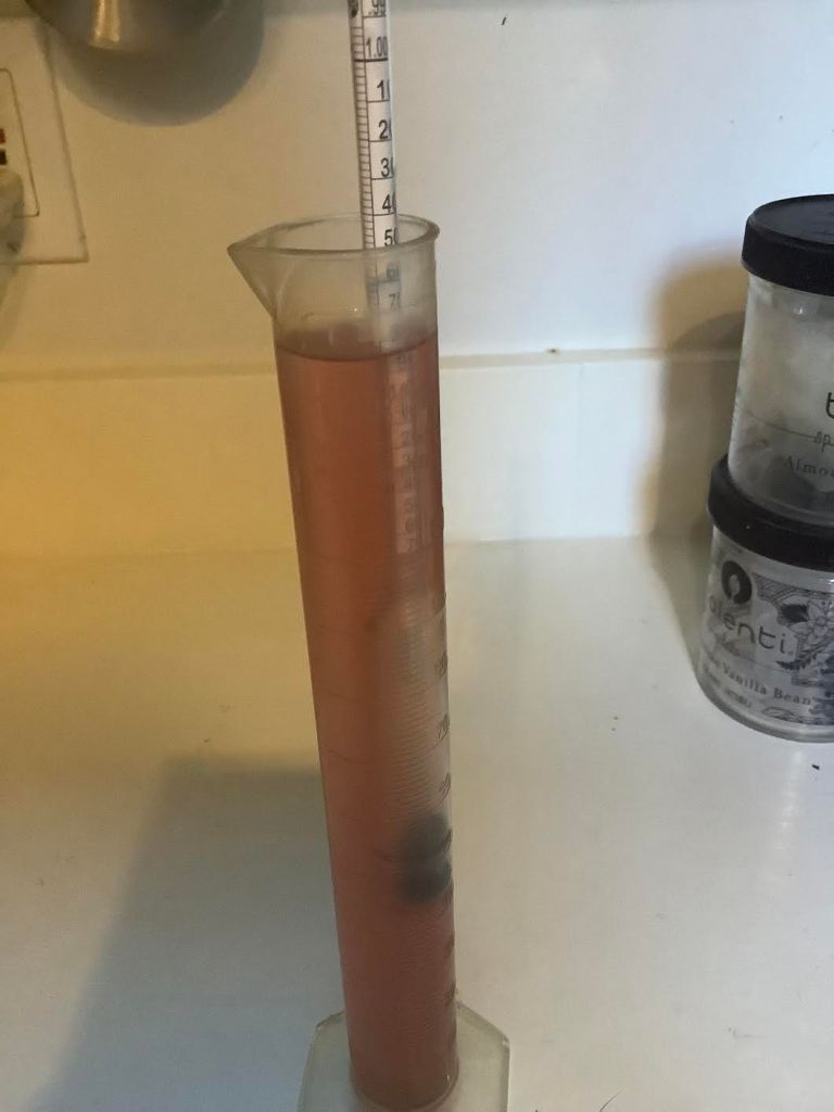 | Pour some of the peach juice+water+sugar into the hydrometer jar to within 1½” of the top. Put the hydrometer into the liquid and give it a little spin to rid it of any bubbles. Read the scale labled Specific Gravity [S.G.] and the scale labled Potential of Alchohol [P.A.] and write down those values in your notes. Pour the ‘wine’ from the hydrometer jar back into the bucket. The P.A. should read around 12%. If it is lower, add more sugar. If it is higher, add some boiled water. Then take another reading. |
