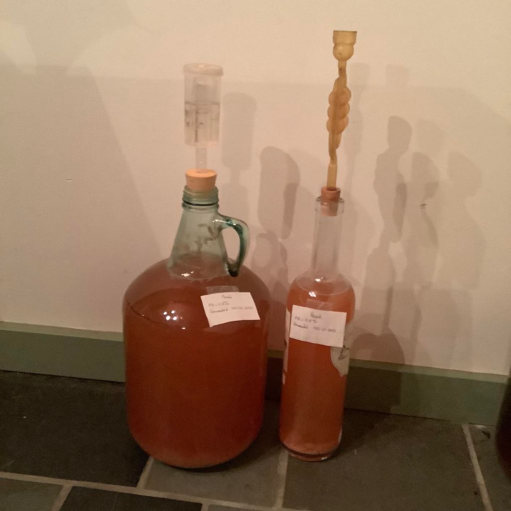 | 1-gallon glass jug 750-ml glass wine bottle funnel 2 air-locks with 1-hole corks Camden Solution | With the Camden Solution, sterilize the jug, the bottle, the funnel, the corks. Pour the excess Solution back into its jar. Using the funnel, pour the fermenting peach juice into the jug, filling it almost up to the neck. What remains in the bucket goes into the glass wine bottle. Fit the air-locks into the corks and snug the corks into the tops of the glass vessels. Pour Camden Solution into the air-locks, up to the half-way point. |