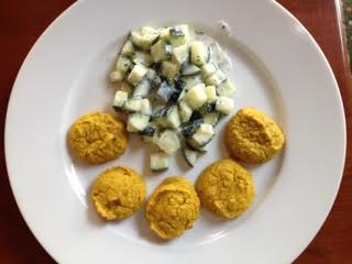 Felafel with Cucumber Raita: 223 calories 7.5 g fat 6 g fiber 11 g protein 22.4 g carbs 130 mg Calcium PB GF The felafel recipe is from Molly Katzen’s Moosewood Cookbook. Having some felafel patties in the freezer makes meal prep rapid.