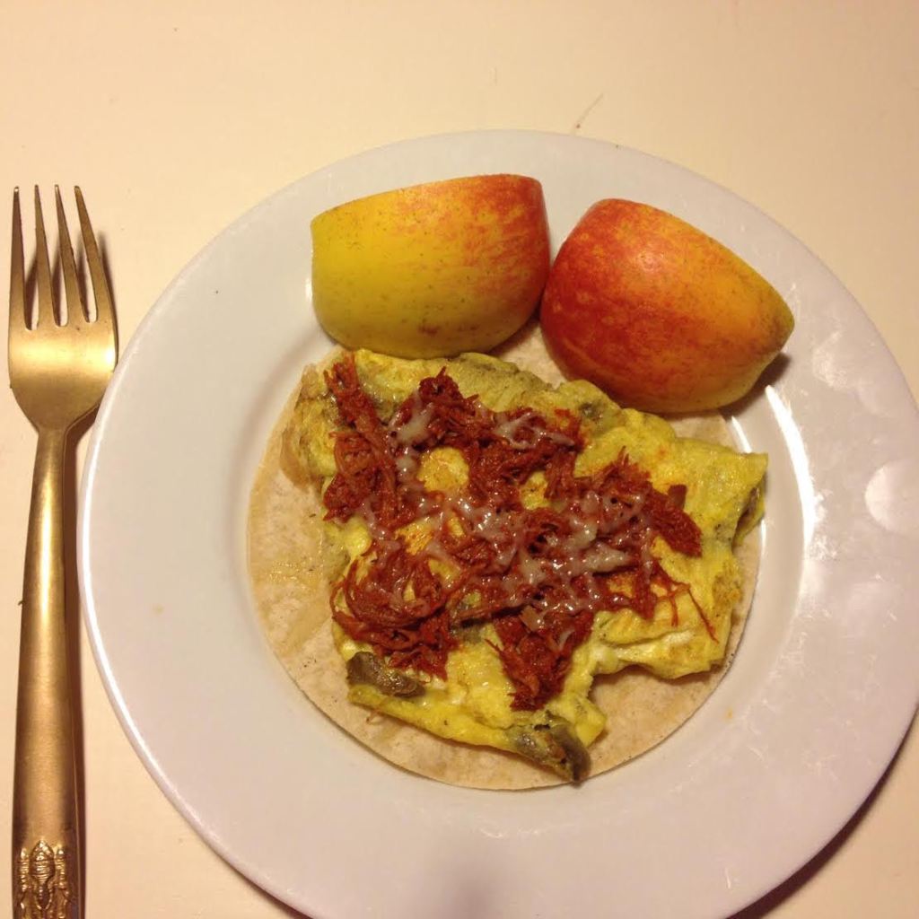 one 6” corn tortilla, MUST be 65 calories per tortilla one 2-oz egg 1 oz roasted green chiles, available canned under the ‘Hatch’ brand 1 Tbsp carne adovada Large pinch oregano, Mexican oregano if you can find it. Hot sauce to taste 1 tsp cheddar cheese, finely grated 1 oz of apple Optional: blackish coffee [53 calories] or blackish tea or mocha cafe au lait [65 calories] or lemon in hot water