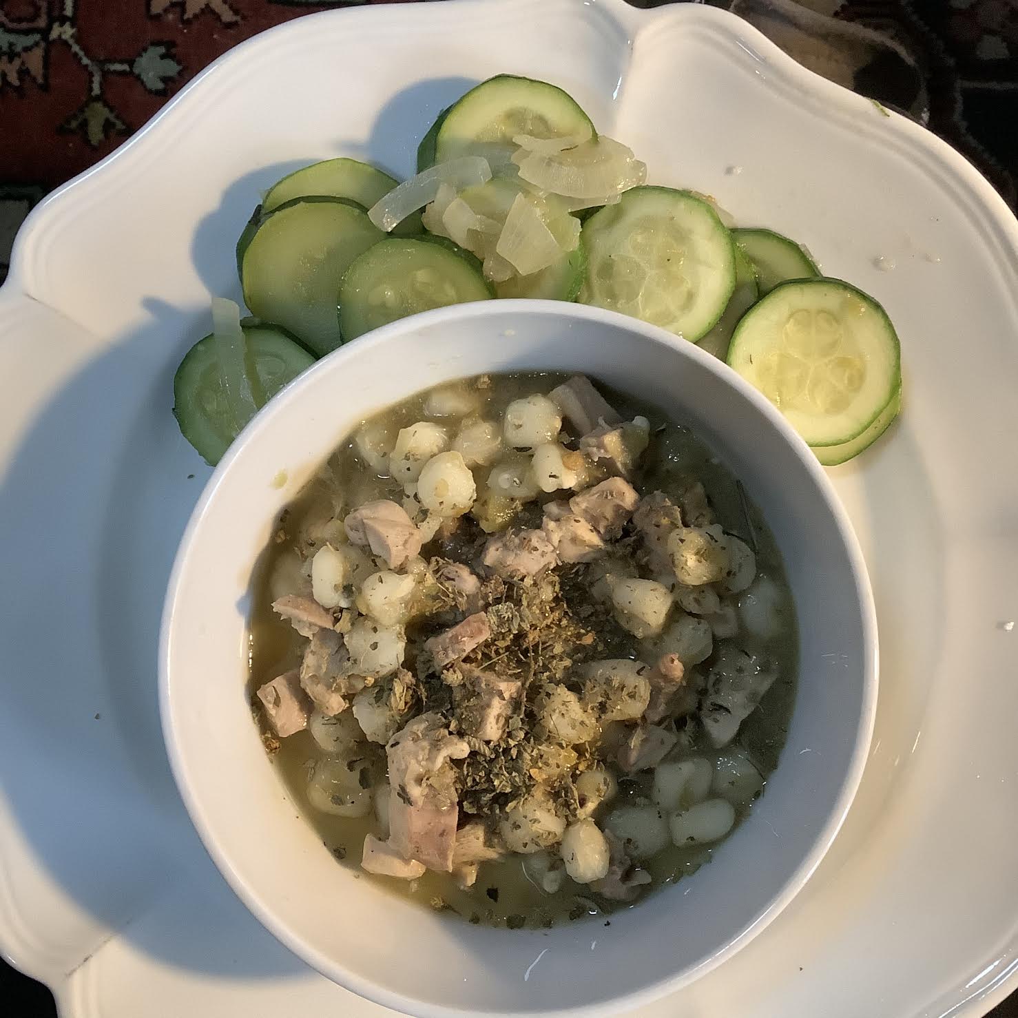 | 1 cup chicken broth 15 oz can of posole, drained | Add chicken and these to saucepan. Simmer until chicken is tender + cooked, ~10 mins. |