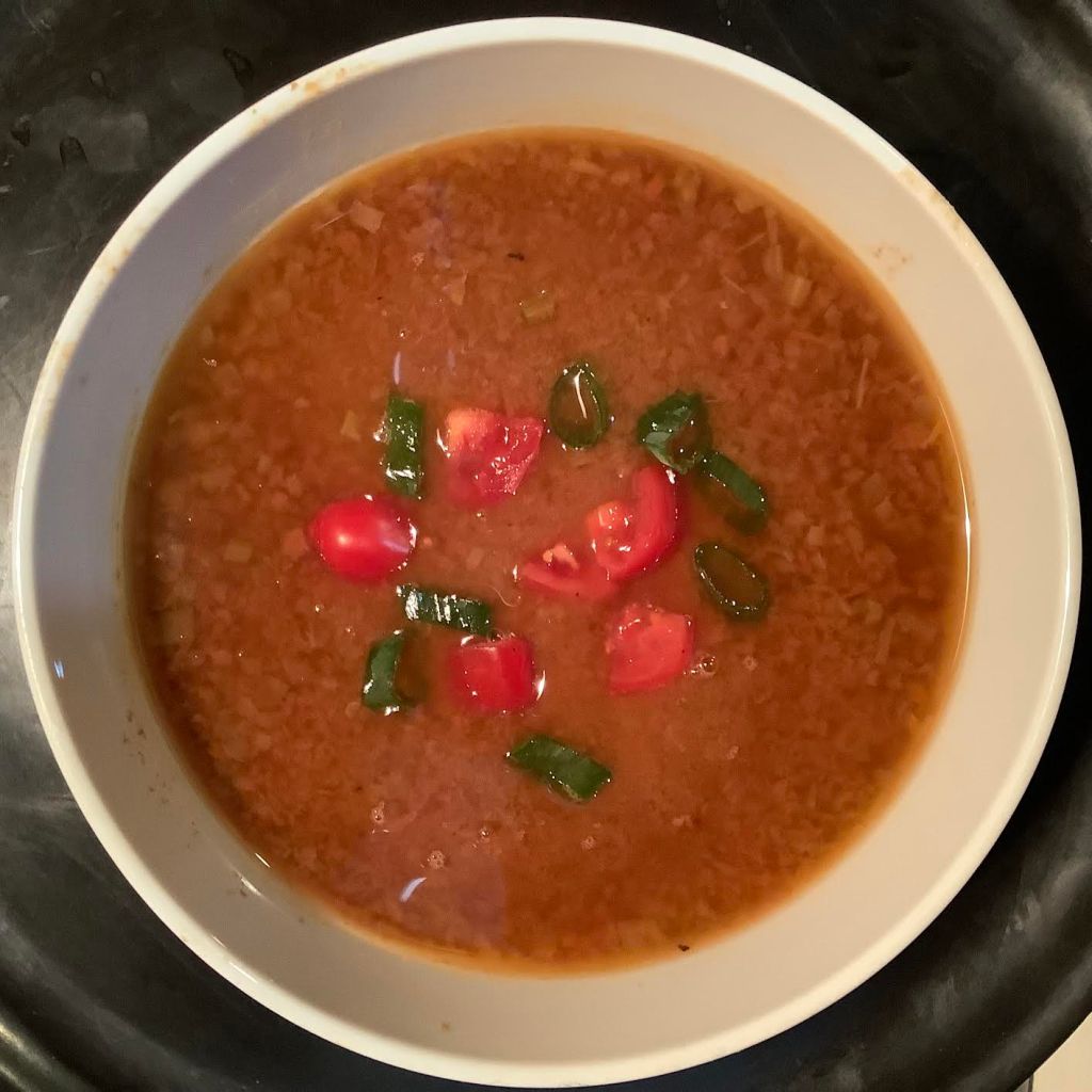 1 cup baked beans, canned ++++ 1/8” slice onion, chopped ++++ 1 stalk celery, chopped ++++ ¾ cup canned or stewed tomatoes ++++ 1½ cup brown stock/beef stock ++++ dash hot sauce ++++ salt & pepper ++++ optional garnish: ½ hard boiled egg, sliced ++++ optional garnish: sliced scallion + diced tomato ++++ optional garnish: lemon slices