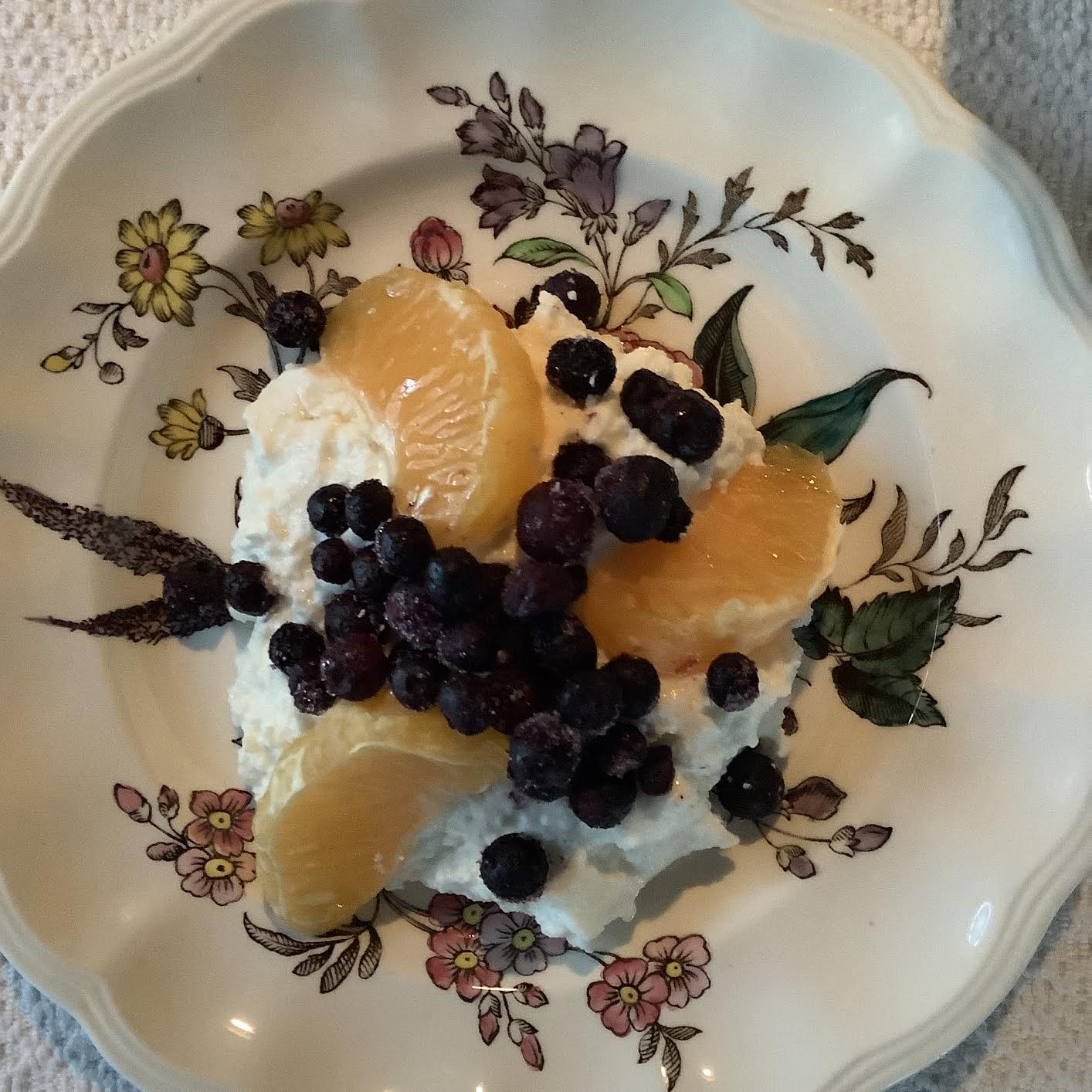 ½ cup reduced-fat cottage cheese 2 Tbsp fat-free French Vanilla yogurt 1 clementine, peeled and sectioned OR 2 oz orange segments 2 Tbsp black currants OR blueberries Optional: blackish coffee [53 calories] or blackish tea or mocha cafe au lait [65 calories] Optional: 5 oz fruit smoothie or berry-yogurt smoothie [88 calories]