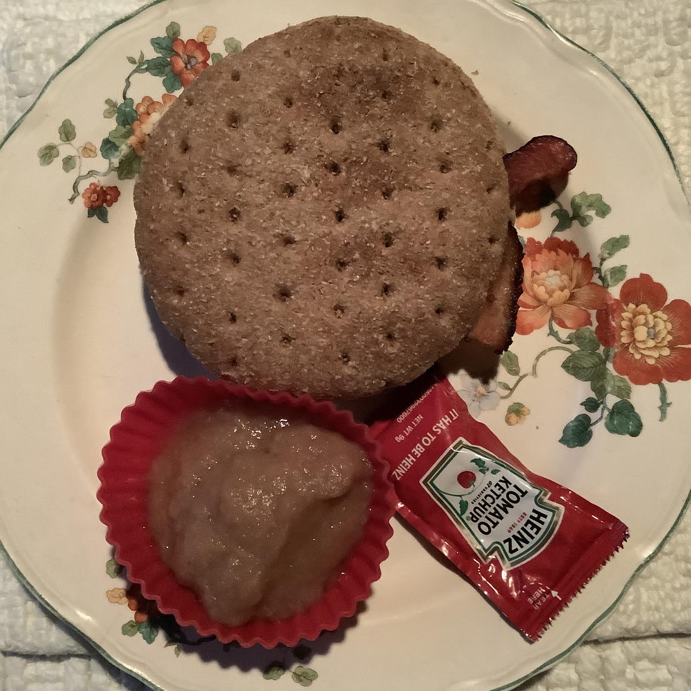 1 Arnold multi-grain Sandwich Thin, top and bottom 2 slices uncured American bacon, cut in half 2 oz applesauce 1 packet ketchup, for fast-food authenticity Optional: blackish coffee [53 calories] or blackish tea or mocha cafe au lait [65 calories] or lemon in hot water