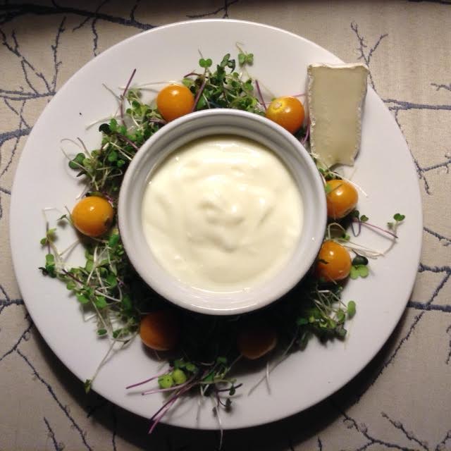 2/3 oz Camembert cheese ½ cup watercress leaves or microgreens ½ cup plain yogurt + 1 tsp honey 2 oz Golden Berries edible flowers [violets, chives, nastursium, or others]
