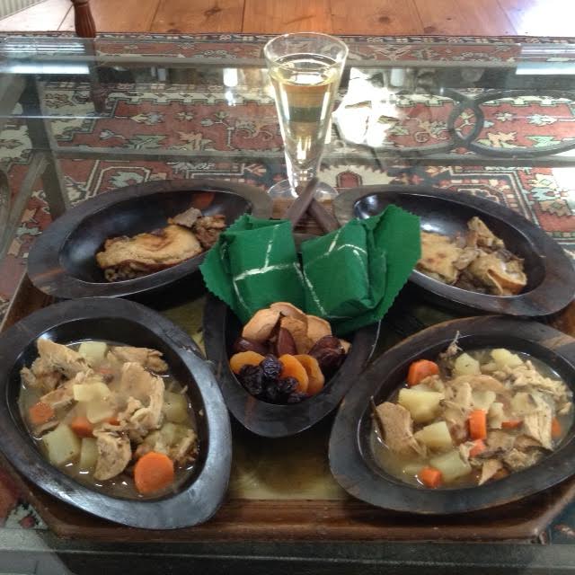 Samwise’s Rabbit Stew: A foraged meal [wild carrots and herbs would have been abundant], originally cooked over a campfire in Ithilien, can be easily prepared in your kitchen. Purists will note that the dried fruit, a gift from Faramir, was given to the Hobbits later, but it adds a nice flavor note to the meal. The potatoes were not part of Samwise’s stew, but he wished that they could be. This stew is the center-piece of our celebration.