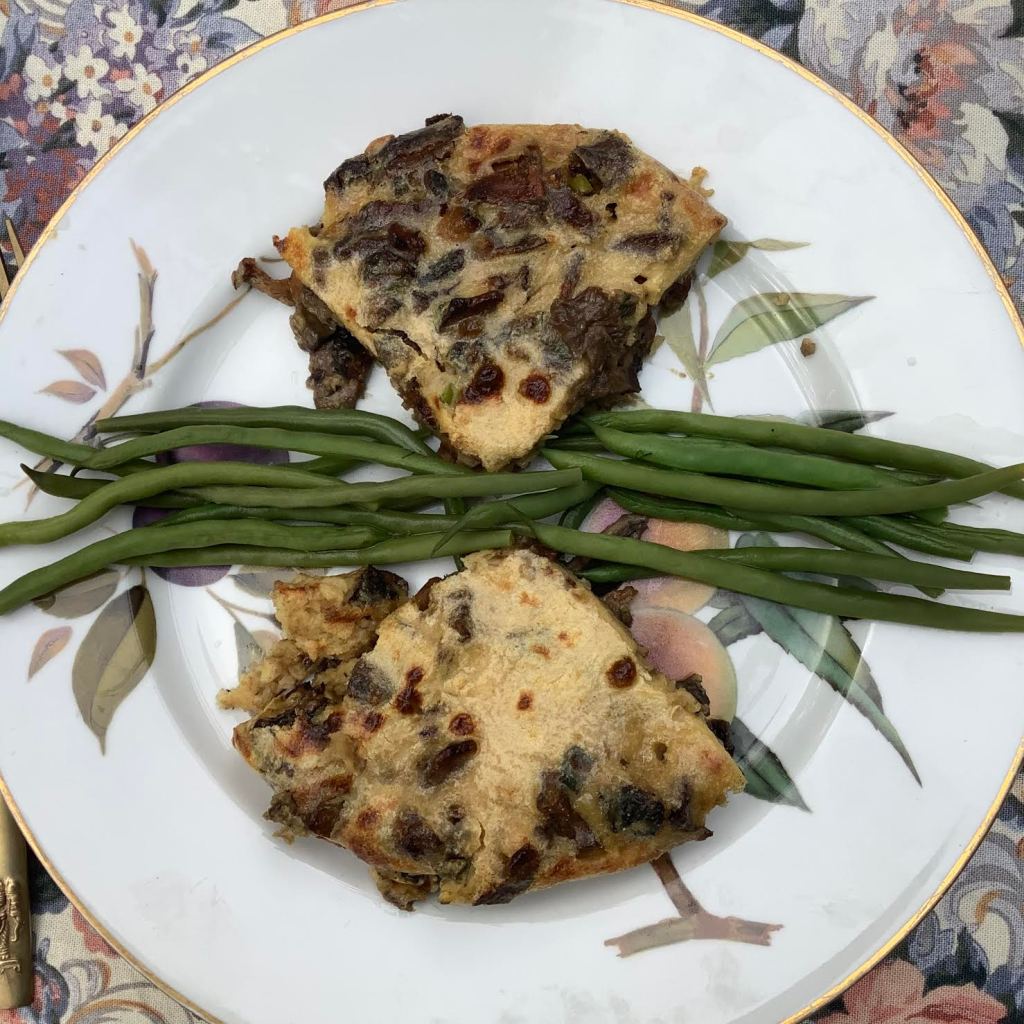 | 2 T Worcesterhire sauce 2 Tbsp white whole wheat flour 1 oz egg [that’s ½ of one US Large egg] 3 Tbsp Parmesan cheese, grated | Stir Worcestershire and flour to combine. Then add the egg and cheeese, an stir.Combine in the pan with the mushroom mixture. |