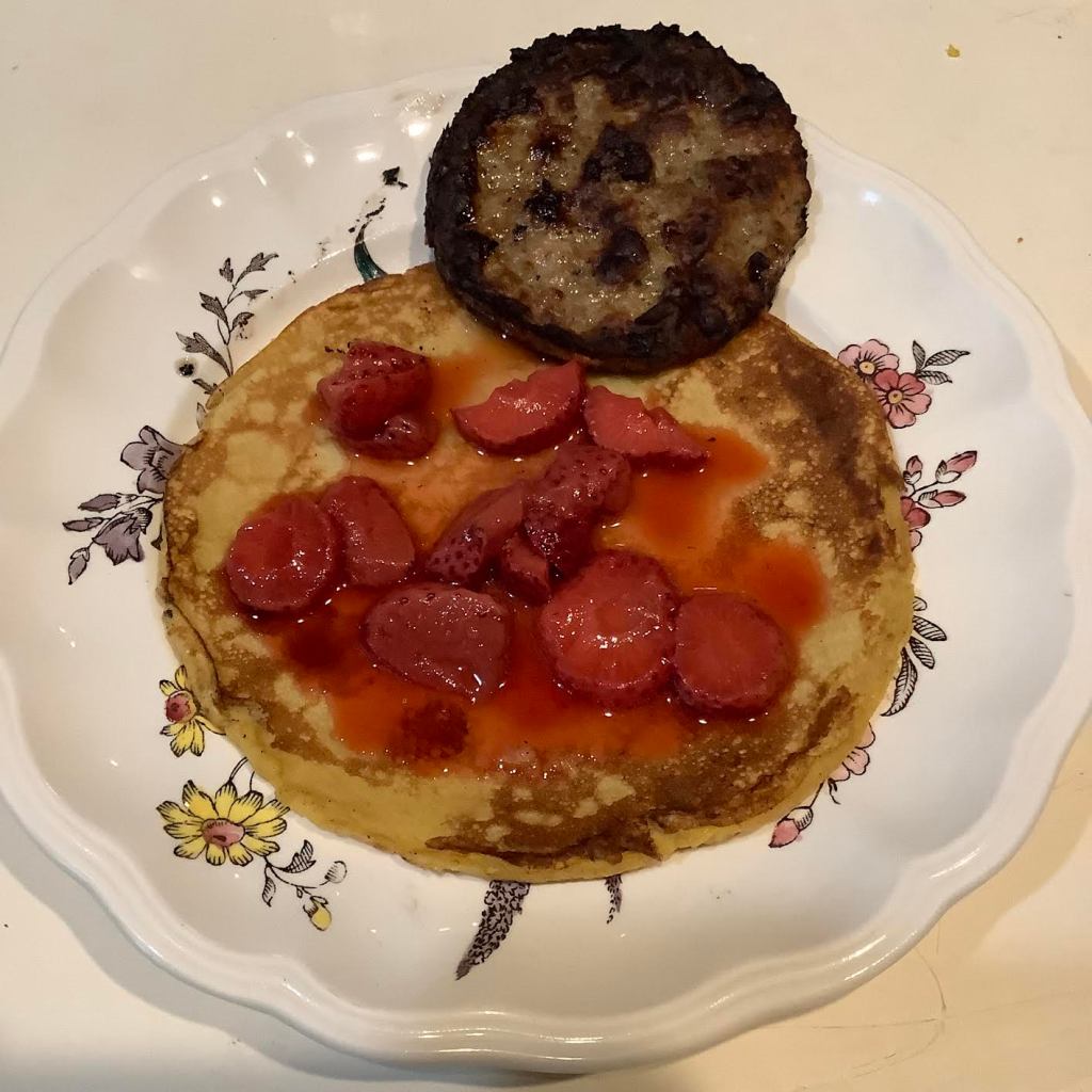 | ½ c Strawberries ½ tsp butter 1 tsp maple syrup | Slice fruit and combine with other ingredients in a small pan. Heat over medium until fruit is cooked through. OR Microwave in a glass jar in short increments until berries are softened. OR Heat syrup and butter together. Put raw berries on the pancake and drizzle with syrup-butter |