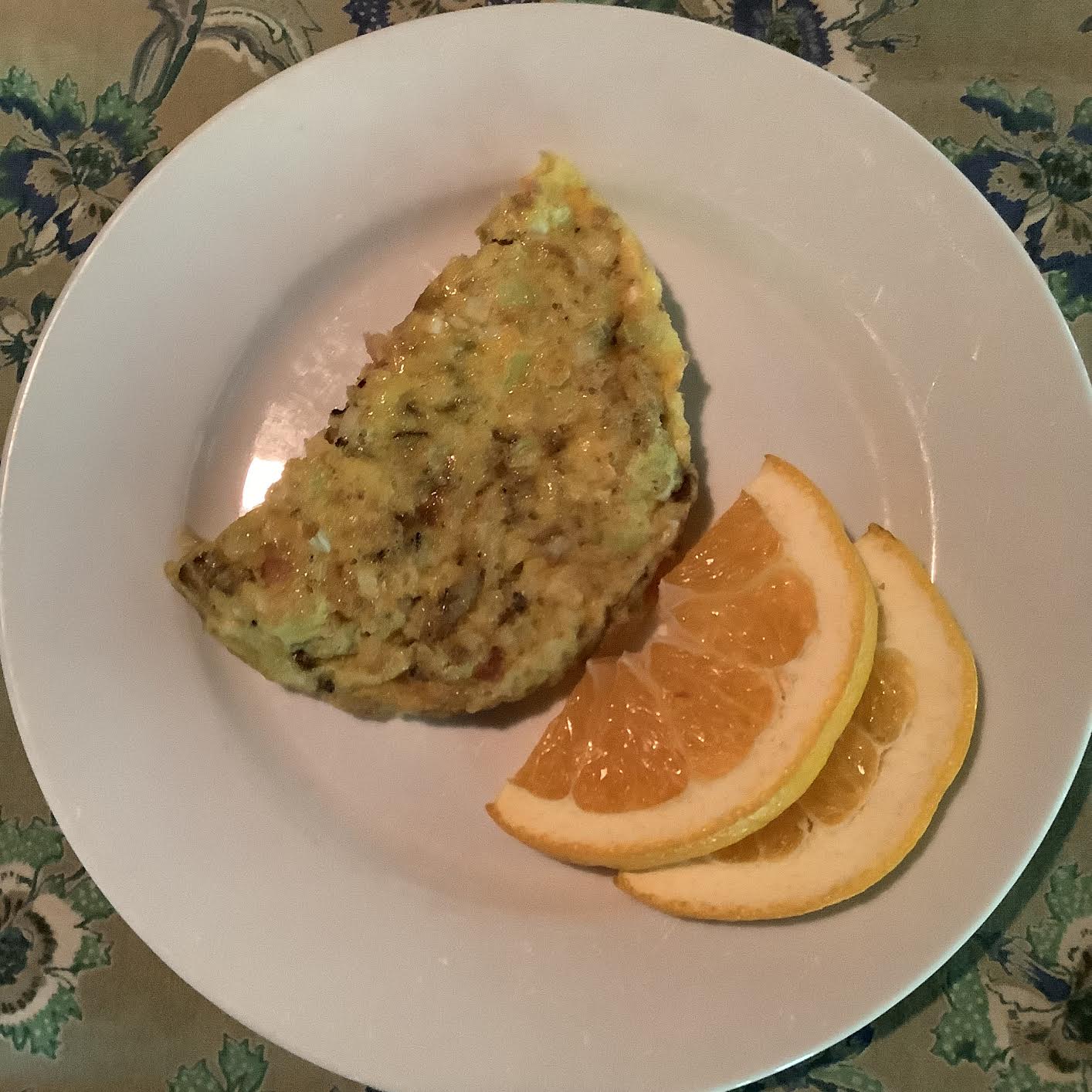 1 two-oz egg 1 Tbsp scallion or leek, chopped ¼ oz mushroom, chopped ½ clove garlic, chopped ¼ oz 3% fat ham, chopped ¼ oz chicken liver pate 1 Tbsp parsley, chopped 2 slices orange Optional: blackish coffee [53 calories] or blackish tea or mocha cafe au lait [65 calories] or lemon in hot water Optional: 5-6 oz fruit smoothie or berry-yogurt smoothie [88 calories]