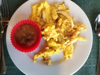 Fish Taco ScrOmelette: 151 calories 8 g fat 1 g fiber 13.4 g protein 5.5 g carbs 59.4 mg Calcium NB: Food values shown are for the ScrOmelette and fruit only, and do not include the optional beverages. PB GF Got some left-over fish and cabbage from your dinner tacos? Add ’em to the eggs for breakfast. Dear Husband was leery – too unusual — but he liked them!