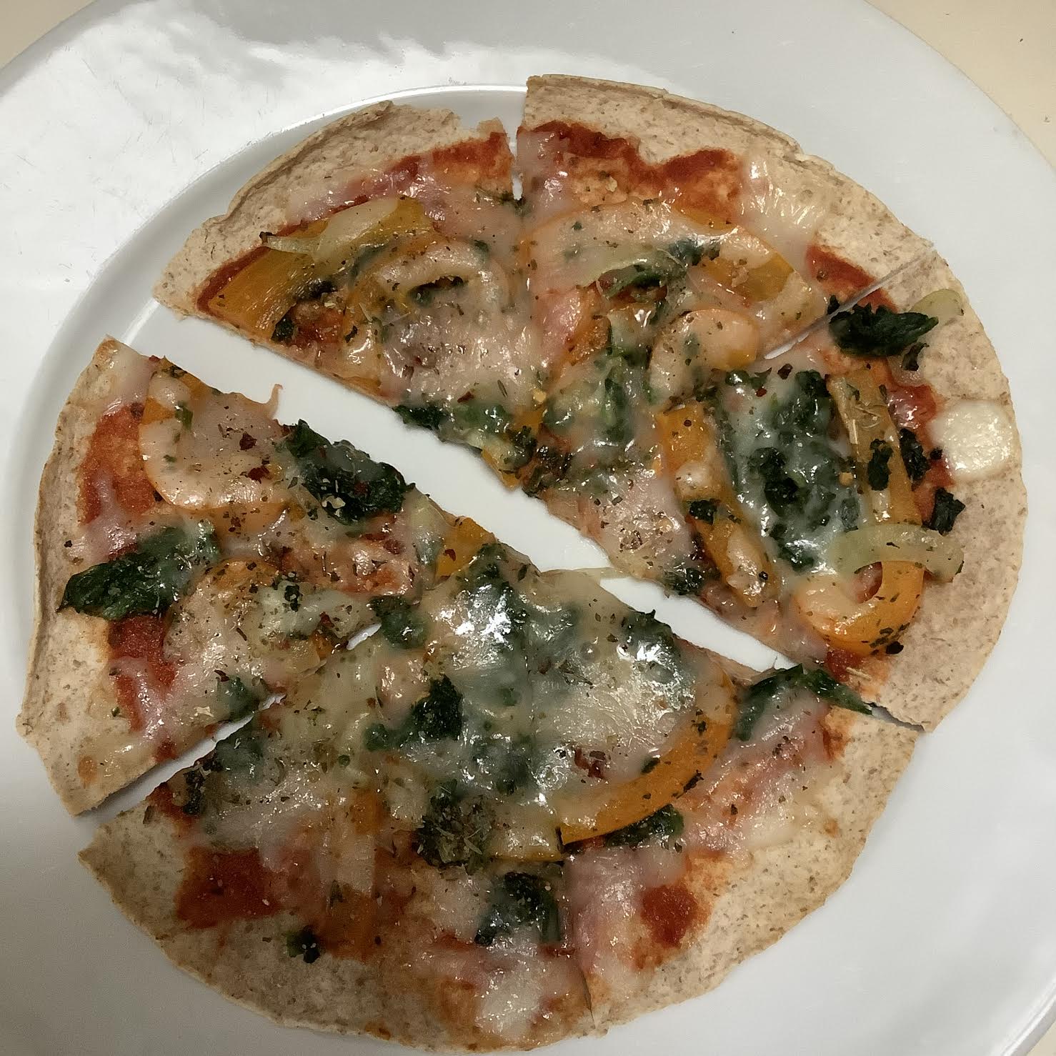 1 whole wheat/grain tortilla at 170-cal [per person] 1 oz mozzerella, grated 1-2 Tbsp tomato puree HINT: buy a can of puree and freeze in small portions ½ oz mushrooms, chopped or sliced 1 ½ oz red pepper, cooked and chopped 1 oz spinach, steamed, squeezed and chopped 1 Tbsp red onion, chopped