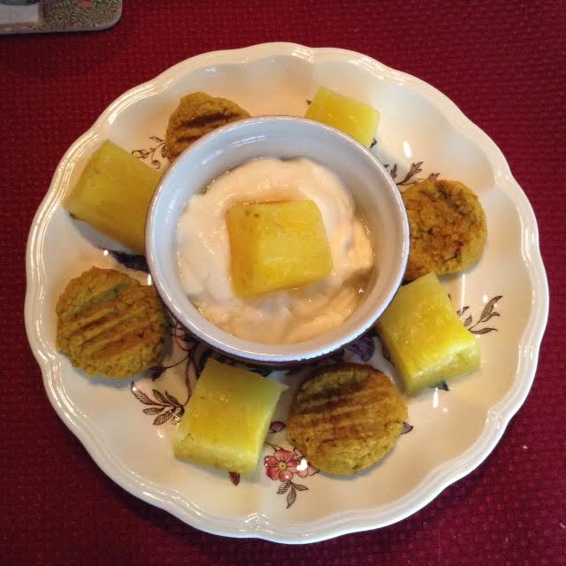 4 felafel patties 4 oz canteloup melon or pineapple 3.5 oz fat-free Greek-style yogurt ½ tsp mint leaves Optional: blackish coffee [53 calories] or blackish tea or mocha cafe au lait [65 calories] or lemon in hot water