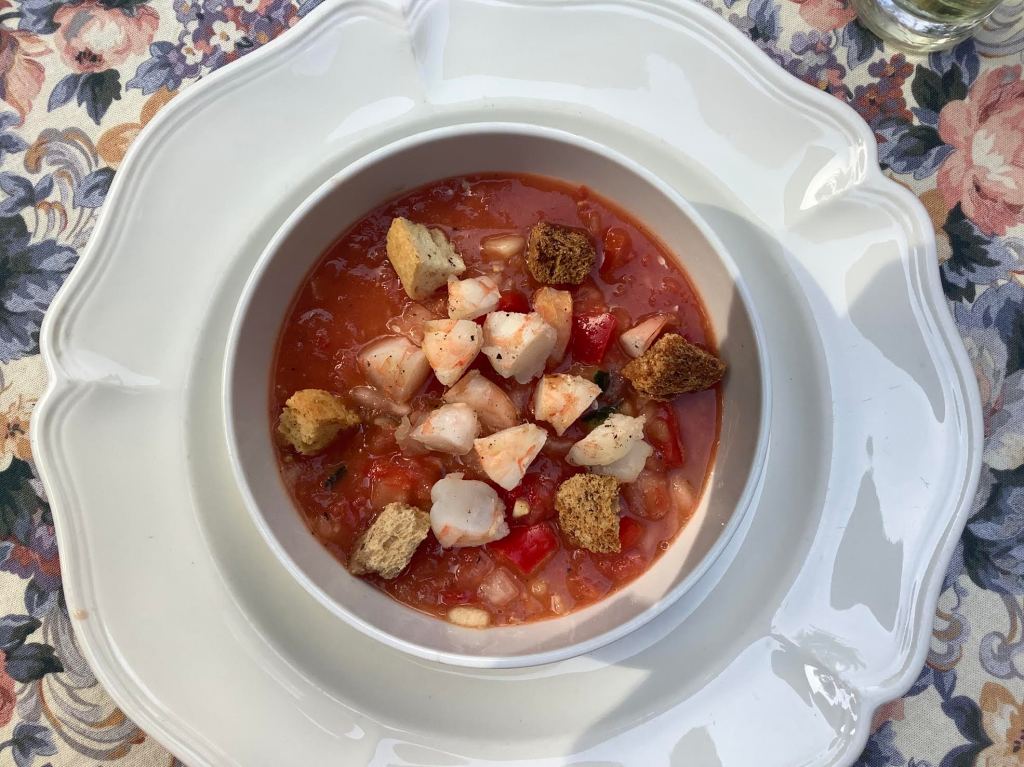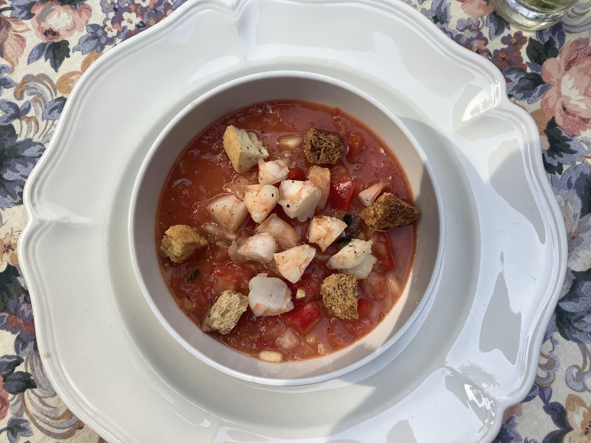 ++1 pound red ripe tomatoes ++++ 1 tsp minced garlic ++++ ½ cup diced onion ++++ ½ cup green or red pepper in ½” dice ++++ ½ cup cucumber, diced ++++ 2 Tbsp red wine vinegar ++++ 1 Tbsp olive oil ++++ ¼ cup tomato juice ++++ generous grinds of black pepper ++++ pinch piment d’Esplette OR Aleppo pepper OR cayenne pepper ++++garnish per serving: 2 oz shrimp, peeled, cooked, cut in ½“ pieces ++++ ¼ oz whole-grain croutons ++