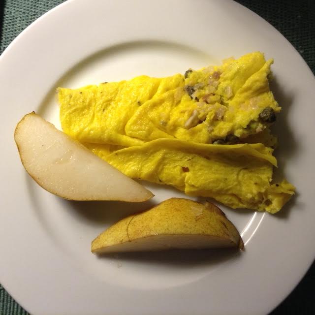 1½ two-oz eggs HINT: If you are serving one person, crack three 2-oz eggs into a small bowl or glass measuring cup. Whip up those eggs and pour half of their volume into a jar with a lid and put it in the ‘fridge for next week. 1/3 oz turkey breast, cooked or raw 1 tsp capers ½ Tbsp shallots, minced ½ Tbsp lower fat cottage cheese 1 oz pear Optional: blackish coffee [53 calories] or blackish tea or mocha cafe au lait [65 calories] or lemon in hot water Optional: 5 oz fruit smoothie or berry-yogurt smoothie [88 calories]
