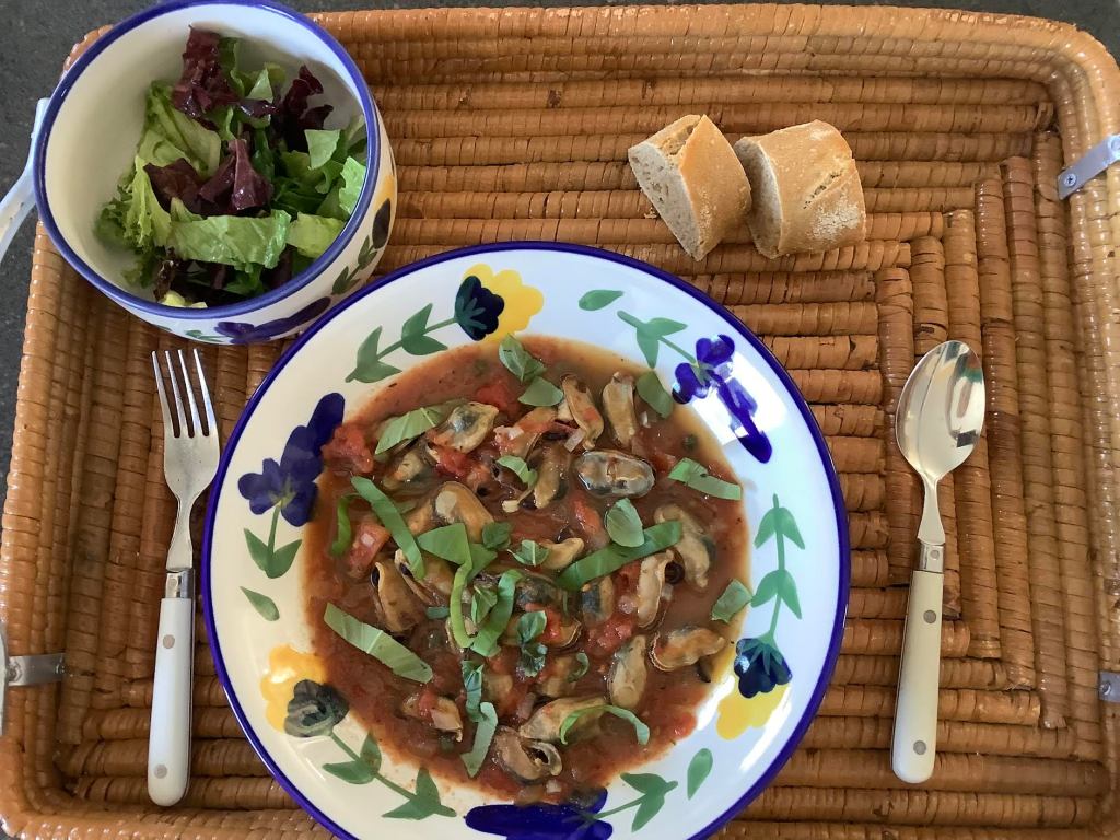 3 oz steamed mussel meat [1# mussels steamed with garlic + thyme + parsley in 1” water, 15 minutes. Drain, saving the broth. Remove shells, saving the meats — you will have extra.] ¾ c tomato-mussel broth, below Side Salad, below fresh basil 1.5 oz whole wheat baguette.