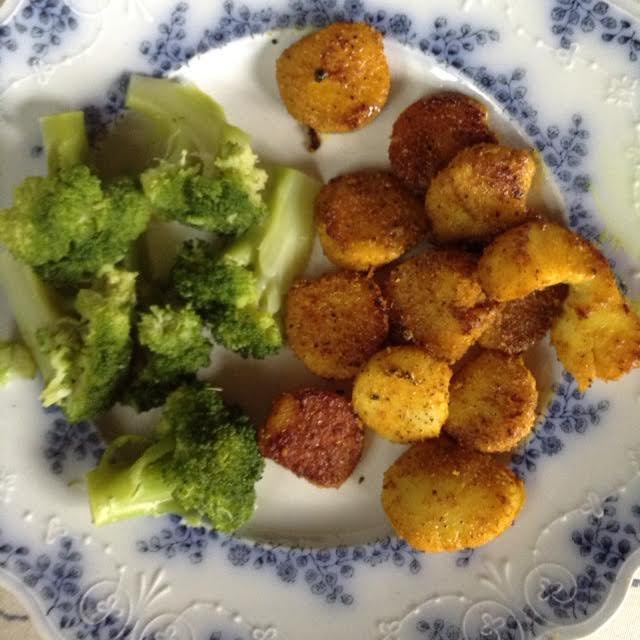 Trim the scallops of the white tissue which may be on the side. Slice the scallops on the equator so that each disk is half its thickness. Pat them dry with paper towels. Sprinkle a plate with the curry powder and dredge the scallops in the powder, coating both top and bottom. Choose a heavy saute pan which is just large enough to hold the scallops in one layer. Heat the pan over medium heat. Add the butter and spray well with non-stick spray. Place the scallops in the melted butter and cook on one side. Turn over and cook further, adding some more non-stick spray if pan seems too dry. When the scallops are done [this takes very little time], remove to your plate. Turn down heat and add the white wine to the pan to deglaze it, scraping up brown bits. Pour over scallops and plate the broccoli. A very easy and special meal.
