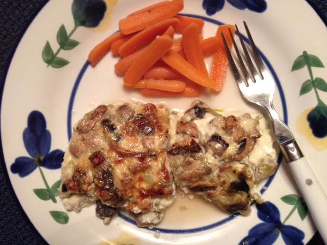 Saute/steam the leeks, garlic, and mushrooms in a little water until soft. Add the wine and cook uncovered until the liquid is nearly gone. Season with salt and pepper. Put the vegetables into a lightly-oil-spritzed baking dish, and cover with the cheese. Whisk eggs, milk, and cottage cheese together and pour over everything in the baking dish. Bake at 375 degrees until the filling is set [knife stuck into center comes out clean]. Remove from oven and cool 15-20 minutes before eating. Prepare the carrots and slice the Sandwich Thin, toasting it if you wish. A tasty Autumn meal.