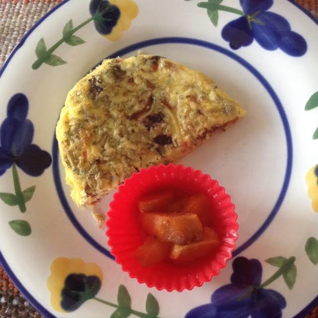 Combine the vegetables, cheese, and marinara. Spritz a ramekin with oil or non-stick spray and add the vegetable mixture. Whisk the egg and pour into the ramekin. Bake in the toaster oven at 350 F. for 12-15 minutes, depending on how you like your eggs. Brew your warm beverage; shake and pour the smoothie, portion that delicious fruit, and enjoy a healthy, yummy start to your day.