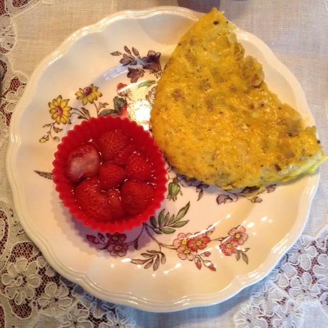 One 2-oz egg ½ oz corned beef 1½ Tbsp sauerkraut [1.5 oz] ½ wedge Laughing Cow cheese 1 tsp catsup 2 oz strawberries Optional: blackish coffee [53 calories] or blackish tea or mocha cafe au lait [65 calories] or lemon in hot water Optional: 5-6 oz fruit smoothie or berry-yogurt smoothie [88 calories]