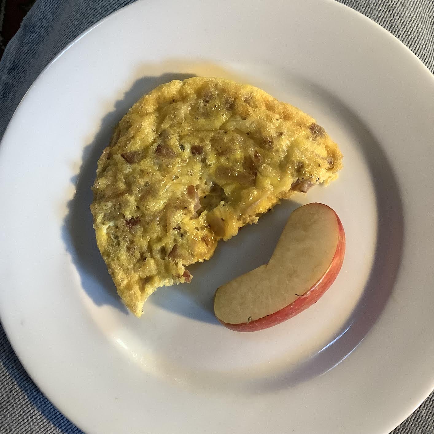 Set toaster oven at 350 degrees F. Spritz some cooking spray into a ramekin. Grate the cheese. Chop the ham and mushrooms, and put them into the ramekin. Whisk together the cheese, egg, and seasonings, and pour that in too. Bake 12-15 minutes, depending on how well set you like your eggs. It will puff up and start to brown a bit. Heat your beverage, shake the smoothie, and portion the fruit. Off to a good start.