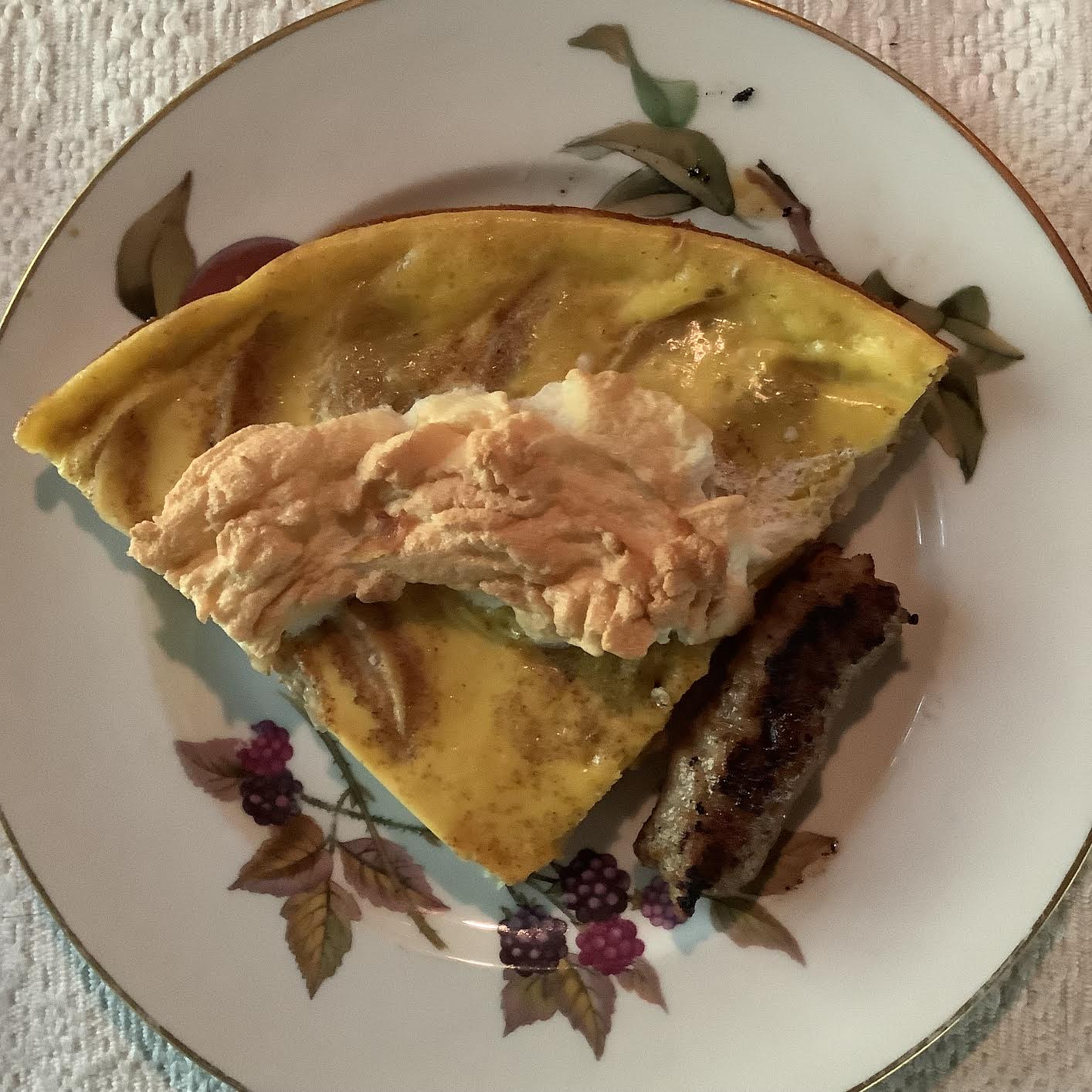 2 two-oz eggs 3 Tbsp sugar 40 g white whole wheat flour 200 ml milk 2¼ cup sliced apples 4 tsp butter 1 oz egg white per serving: 1 chicken sausage [33 calories each] Optional: blackish coffee [53 calories] or blackish tea or mocha cafe au lait [65 calories] or lemon in hot water