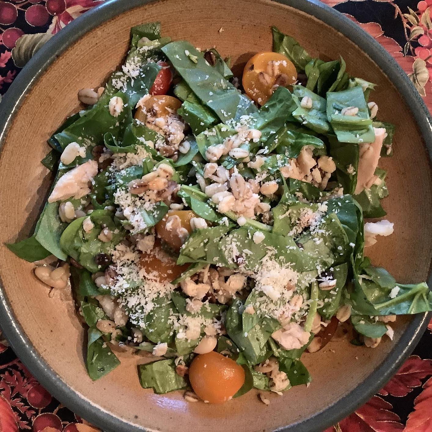Cook the barley and combine it with chunks of tuna. Put salad greens, beans, and marinade in serving bowl and toss. Add salt and gently toss in the barley-tuna to combine. Put tomatoes on top, then sprinkle with Parmesan. Gosh its good – and filling!