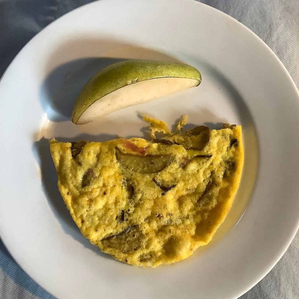 1 two-oz egg 1 Tablespoon ricotta 1 oz chantrelle/cepe or other ‘wild’ mushrooms 1½ tsp Parmesan cheese, grated 0.1 oz chopped prosciutto 1 oz pear or apple Optional: 5 oz fruit smoothie or berry-yogurt smoothie [88 calories] Optional: blackish coffee [53 calories] or blackish tea or mocha cafe au lait [65 calories] or lemon in hot water