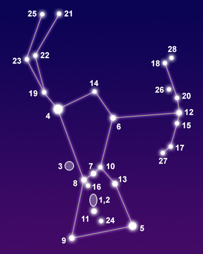 Orion was a mortal man who loved to hunt. He was good at his craft and didn’t mind telling you that no animal could escape him — neither the wild bulls, nor the boars, nor the deer, nor the lions, nor the bears — and on and on. The Earth Goddess Gaia became very annoyed by this — by the slaughter of her animals and by his braggadocio. She sent a lowly Scorpion on a mission to assassinate the Hunter. And so it was that one day, while Orion was pontificating on his magnificence, the Scorpion stung him on the heel and the Hunter died. The Gods placed him in the Winter sky to remind men not to boast. Orion is seen facing us, with a bow [some say a shield] in his left arm and his right arm up-raised. Three stars form a belt at his waist, from which hangs a sword. He is accompanied by his two dogs, Sirius and Procyon who are on his right. All Winter long, he strides from East to West across the sky. In the Spring, when Orion is disappearing into the West, the constellation Scorpio rises in the East to chase him out of the sky.