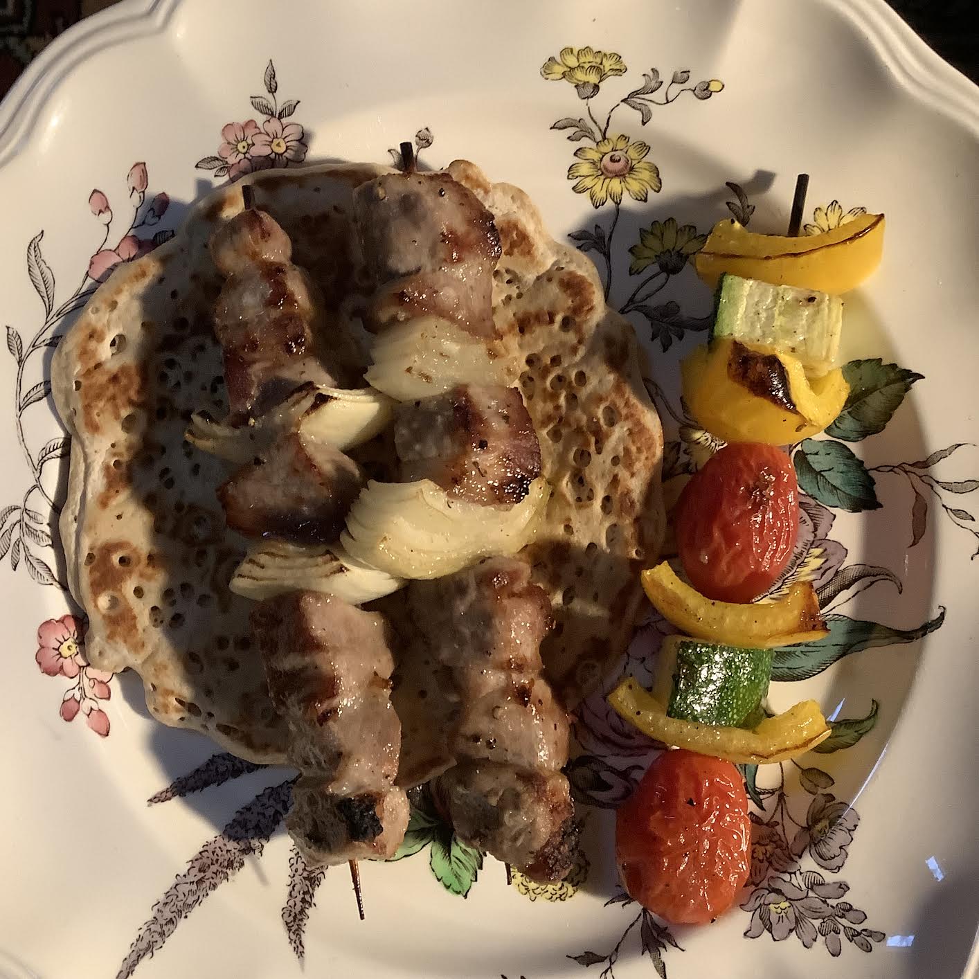 Shashlik: 292 calories 10g fat 3 g fiber 19 g protein 32 g carbs 53.4 mg Calcium PB GF – if using GF bread Here is the meal of nomadic herdsmen in the grasslands of Asia and Eastern Europe. Originally made with lamb or beef, this Ukrainian version uses pork shoulder. It can be enjoyed with or without the bread. The recipe is from natashaskitchen.com. For the flatbread, I used Mongol Bread, full recipe in the blog about Kublai Khan, 4 May 2022