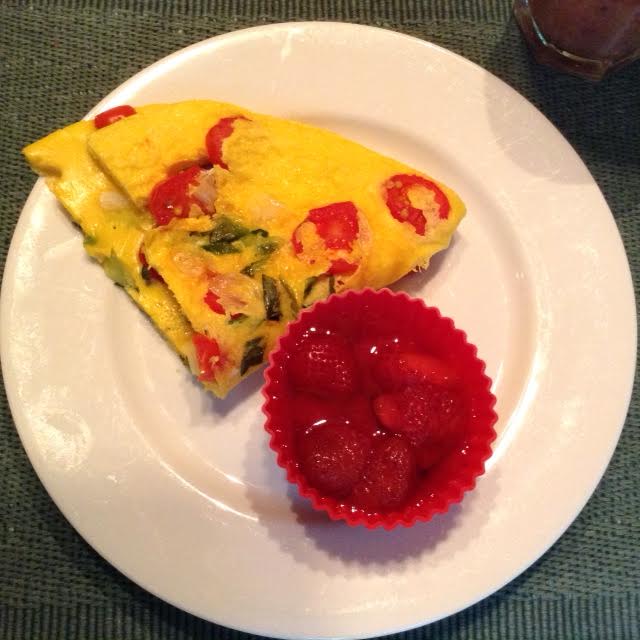 1½ two-oz eggs  HINT: If you are serving one person, crack three 2-oz eggs into a small bowl or glass measuring cup. Whip up those eggs and pour half of their volume into a jar with a lid and put it in the ‘fridge for next week.  1 oz scallions [2 large], sliced diagonally 2 oz strawberries 2 oz tomatoes, cherry or standard [I used cherry tomatoes, sliced cross-wise] 2 Tbsp fresh basil, sliced across the leaf  Optional: blackish coffee [53 calories] or blackish tea or mocha cafe au lait [65 calories] or lemon in hot water   Optional: 5 oz fruit smoothie or berry-yogurt smoothie [88 calories]